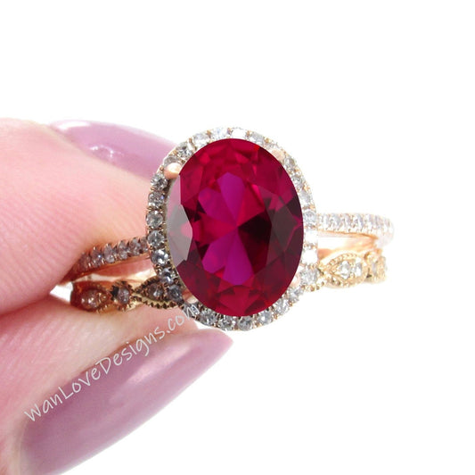Anello di fidanzamento con diamante rubino a forma ovale in oro rosa Halo Anello di fidanzamento unico da donna vintage Fede nuziale Milgrain con foglia Half Eternity
