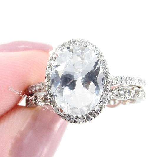 Anello di fidanzamento ovale con zaffiro bianco set vintage unico anello di fidanzamento in oro bianco da donna anello Milgrain matrimonio promessa nuziale, pronto per la spedizione