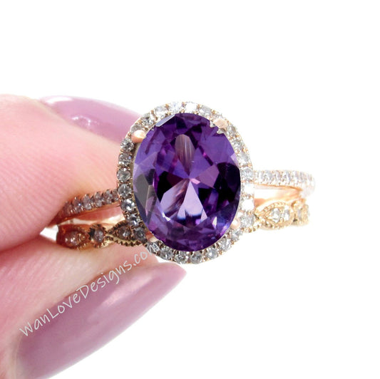 Anello di fidanzamento con diamante e zaffiro viola a forma ovale con diamante in oro rosa Halo Anello unico da donna vintage Fede nuziale a foglia mezza eternità