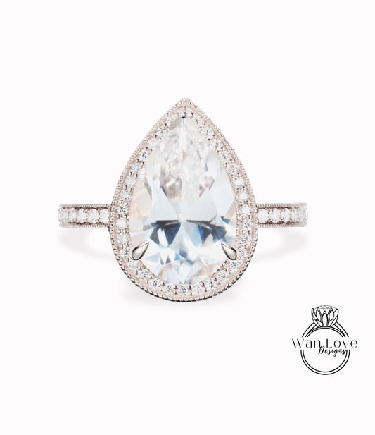 Zaffiro bianco Oro 14kt Diamante Art Déco Unico Pera Halo CON Anello Milgrain, WanLoveDesigns