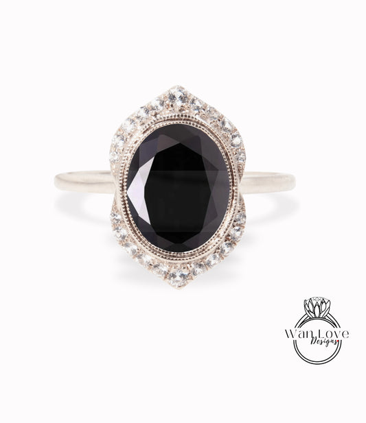 Spinello nero e diamante Art Deco unico lunetta ovale Halo CON o senza anello di fidanzamento Milgrain, personalizzato, oro rosa 14k 18k, WanLoveDesigns