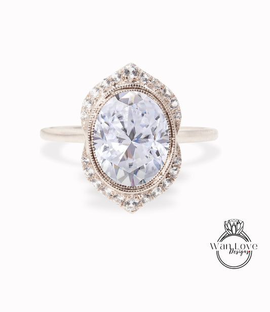 Zaffiro bianco e diamante Art Déco unico lunetta ovale Halo CON o senza anello di fidanzamento Milgrain, personalizzato, oro rosa 14k 18k, WanLoveDesigns