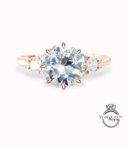 Anello di fidanzamento rotondo con zaffiro bianco vintage in oro bianco Art Deco Cluster anello di fidanzamento da donna 8 poli Moissanite matrimonio anniversario nuziale