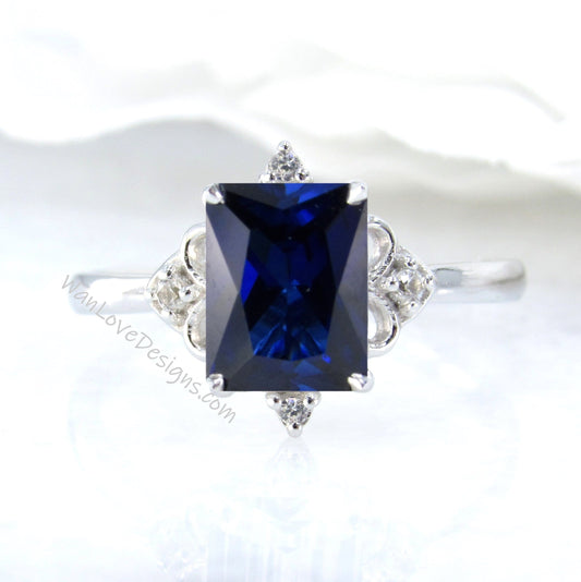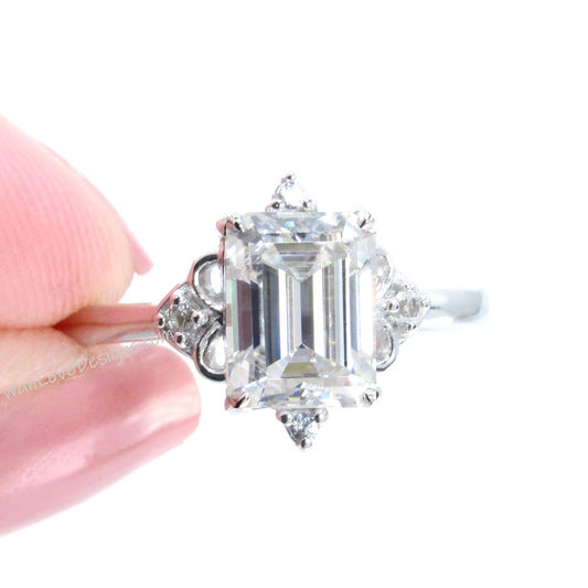 Anello di fidanzamento decorato in stile Art Deco con zaffiro bianco e diamanti, delicato smeraldo, oro 14kt 18kt, anniversario di matrimonio in platino, WanLoveDesigns