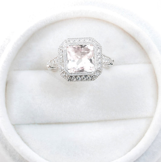 Anello di fidanzamento con zaffiro rosa chiaro in oro vintage con castone Art Déco Anello di fidanzamento Halo da donna con diamante antico Matrimonio Milgrain Regalo nuziale
