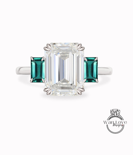 Grey Moissanite & Diamond Emerald Trillion Triangle cut Engagement Ring 3 gemstone Custom Ring-14k 18k White Yellow Rose Gold-Platinum-Wedding Bridal Ring Anniversary Gift