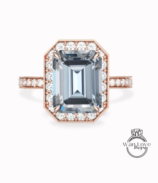 Grey moissanite & Diamond Emerald cut milgrain bezel halo engagement ring vintage diamond ring rose gold ring art deco ring promise ring anniversary