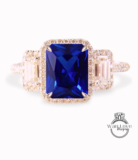 Anello baguette con zaffiro blu smeraldo e diamanti, anello di fidanzamento Art Déco, anello con pietra laterale con diamante, anello con tre pietre Halo con diamante
