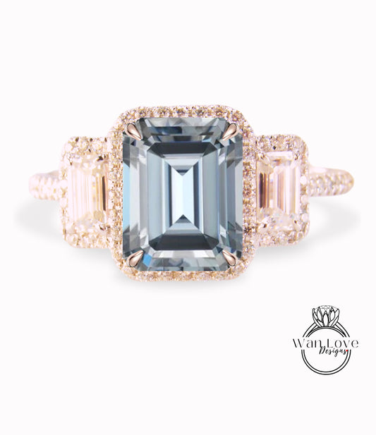 Anello Baguette con Moissanite Grigio Smeraldo Halo e Diamanti, Anello di Fidanzamento Art Déco, Anello con Pietra Laterale con Diamanti, Anello con Tre Pietre Halo con Diamanti