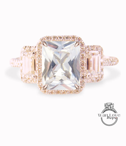 Anello baguette con zaffiro bianco e diamanti smeraldo Halo, anello di fidanzamento Art Déco, anello con pietra laterale con diamante, anello con tre pietre Halo con diamante