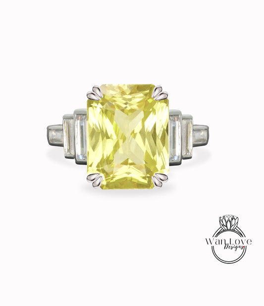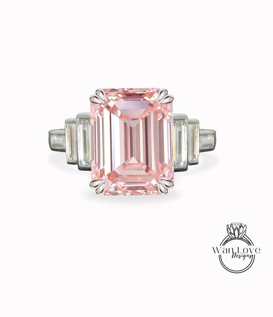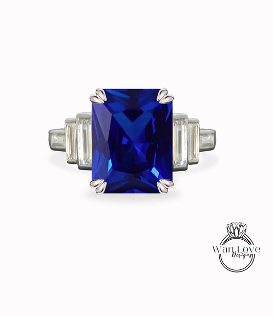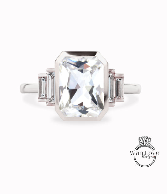 Diamond Emerald cut Baguette Bezel 5 Gemstone Art Deco Certified Diamond Engagement Ring Custom Wedding Anniversary Gift
