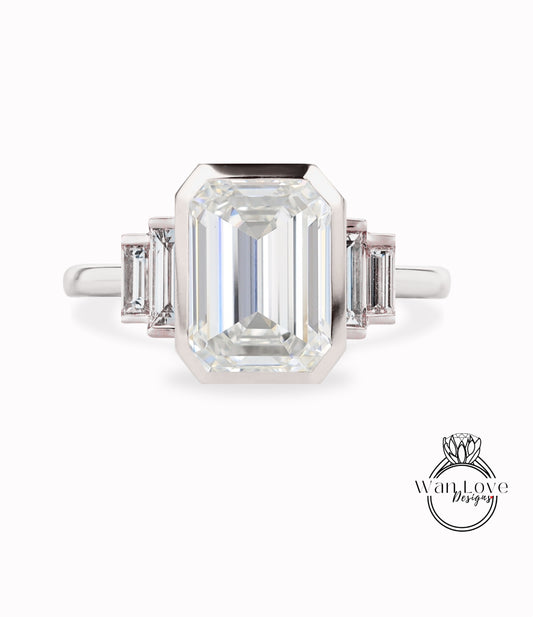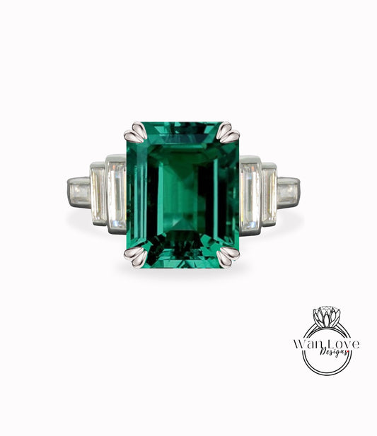Smeraldo Baguette Lunetta 5 Gemma Moissanite Anello di fidanzamento Regalo personalizzato per anniversario di matrimonio 14kt Oro 18kt, Platino