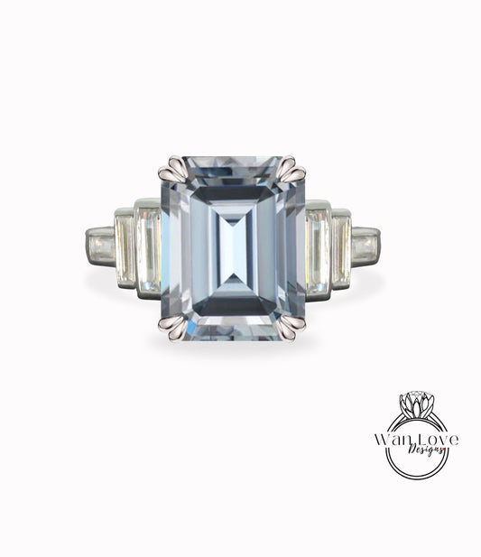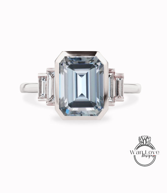 Grey Moissanite & Diamond Engagement Ring Emerald cut Baguette 7 Gem Stone bezel set ring wedding ring Bridal ring Moissanite Anniversary gift