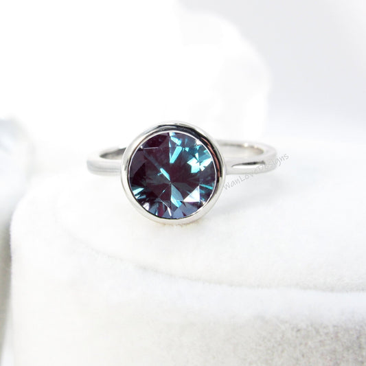 Anello di fidanzamento con castone rotondo con alessandrite taglio rotondo da 2 ct, anello nuziale in oro 14K, fede nuziale semplice, montatura con castone, regalo per anelli di anniversario
