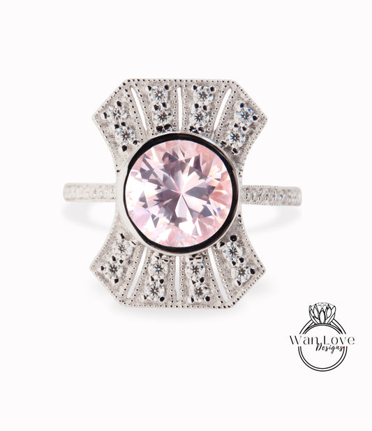 Anello di fidanzamento con zaffiro rosa chiaro a forma rotonda vintage Anello di fidanzamento unico in oro bianco da donna Anello a grappolo con castone Art Deco con diamanti Promessa