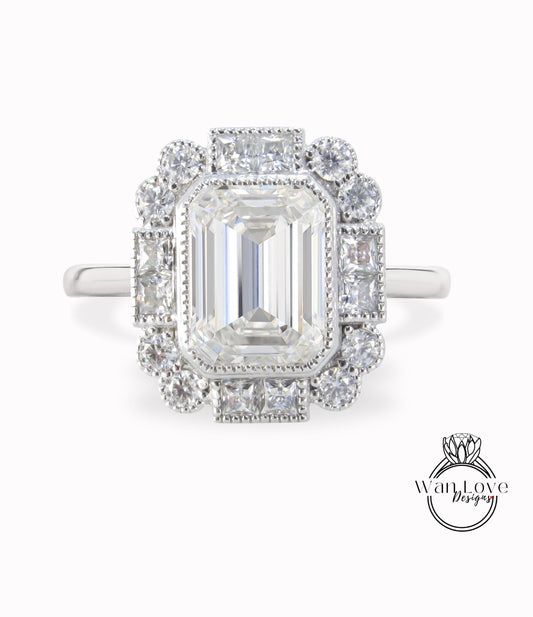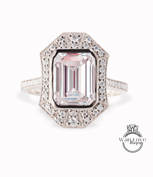 Emerald cut Diamond engagement ring halo ring vintage diamond milgrain bezel ring rose gold ring art deco ring wedding bridal ring anniversary gift