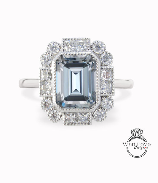 Grey moissanite & Diamond Emerald cut milgrain bezel halo engagement ring vintage diamond ring rose gold ring art deco ring promise ring anniversary