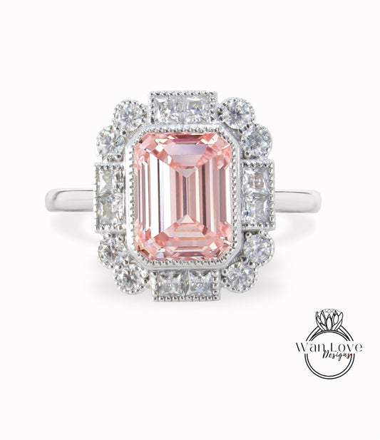 Anello Art Deco Halo con zaffiro pesca e diamante taglio smeraldo, anello Halo con castone Milgrain, anello con zaffiro Moissanite, anello di ispirazione vintage