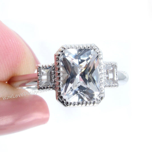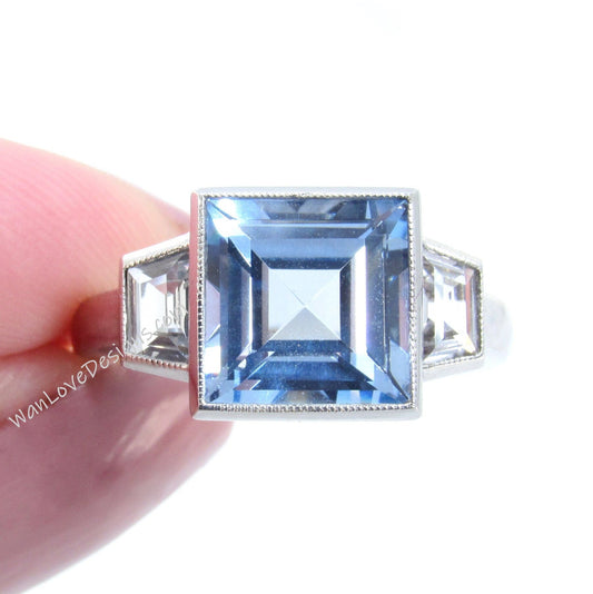 Anello di fidanzamento con spinello acquamarina taglio principessa da 3 CT, anello con castone Milgrain, anello nuziale con zaffiro bianco trapezoidale laterale, anello da sposa