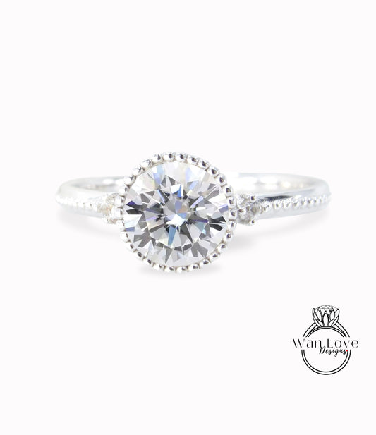 Anello con castone Milgrain Moissanite e diamante taglio rotondo Anello di fidanzamento Anello con castone rotondo Art Deco Anello da sposa promessa anello regalo di anniversario