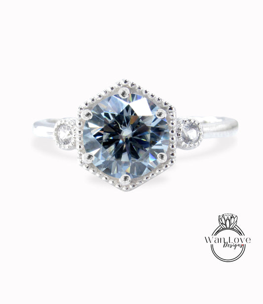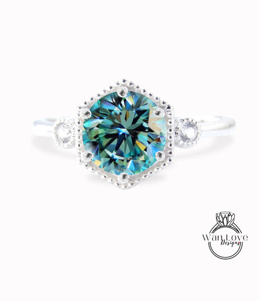 Anello con castone esagonale Milgrain Anello di fidanzamento con diamante Moissanite blu Anello Art Déco Taglio rotondo 6 punte Anello di nozze Anello di promessa nuziale anniversario
