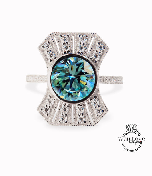 Anello con castone Milgrain Moissanite blu e diamante taglio rotondo Anello di fidanzamento Anello con castone rotondo Art Déco Anello da sposa con promessa di anniversario