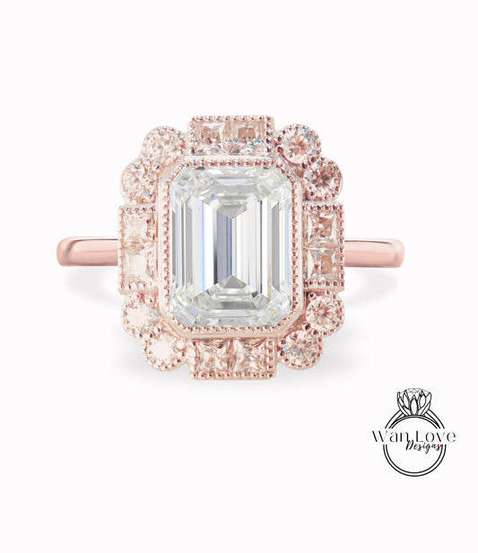 Anello di fidanzamento moissanite con taglio smeraldo anello aureola anello con castone milgrain con diamanti vintage anello in oro rosa anello art deco anello di promessa anniversario