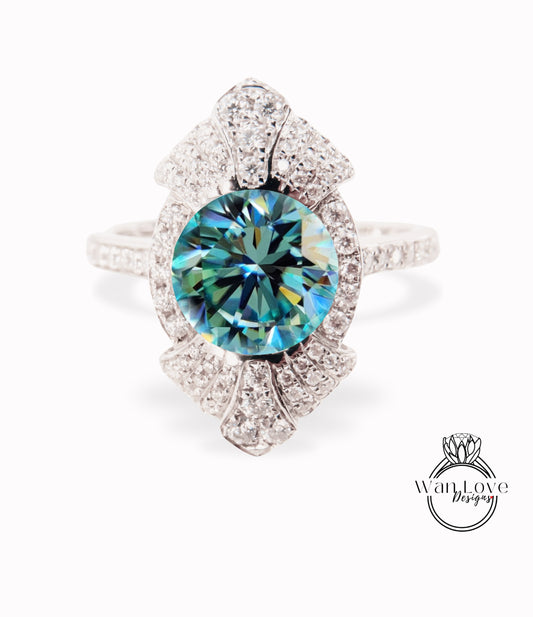 Anello di fidanzamento in Moissanite blu a forma rotonda vintage Anello di fidanzamento unico in oro bianco da donna Anello a grappolo con castone Art Deco con diamanti Promessa