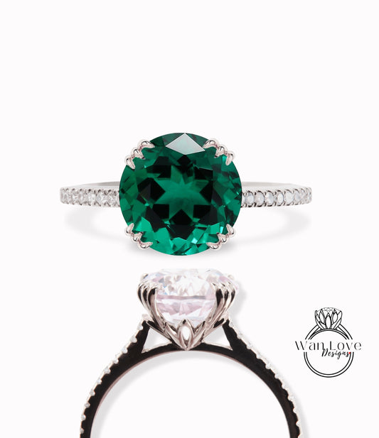Anello di fidanzamento con 8 punte Milgrain con castone ovale rotondo con 3 gemme di smeraldo e diamante, personalizzato, matrimonio, oro giallo rosa bianco 14k 18k