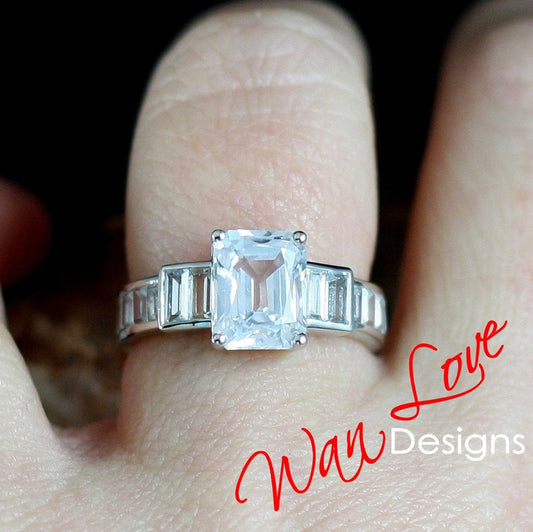 Anello di fidanzamento con zaffiro bianco, castone con smeraldo, taglio baguette, 14k 18k bianco giallo oro rosa-platino-matrimonio personalizzato, anniversario