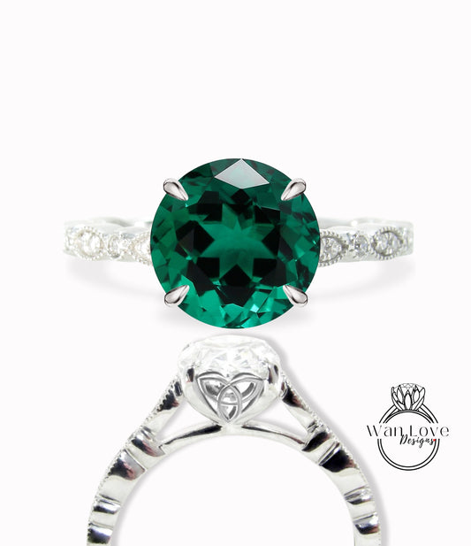 Anello di fidanzamento con smeraldo di forma rotonda, unico anello in oro rosa con diamanti e aureola, anello vintage con punta milgrain, anello nuziale con promessa di anniversario
