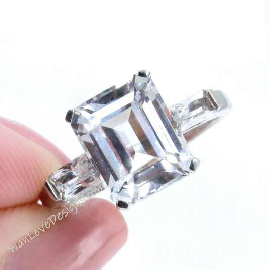 Anello di fidanzamento vintage con zaffiro bianco taglio smeraldo, anello con tre pietre, anello baguette antico art deco, anello nuziale anniversario ~ Pronto per la spedizione