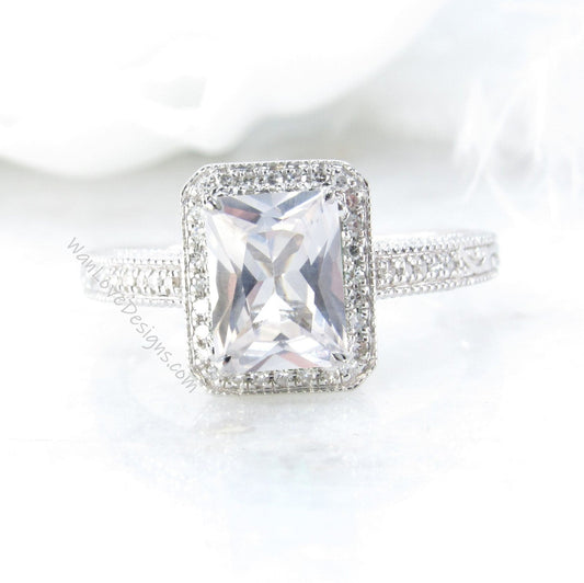 Anello di fidanzamento solitario Milgrain in filigrana con zaffiro bianco-Smeraldo-4ct-10x8mm-Argento rodiato-Nozze-Sz 6.5-Regalo di anniversario-Pronto per la spedizione