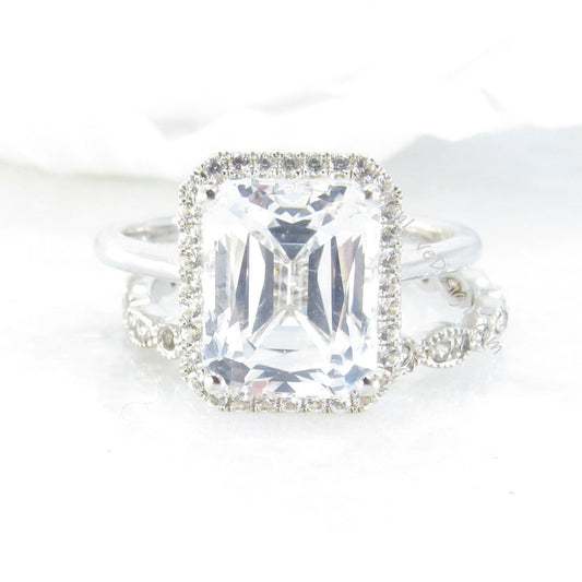 Set di anelli di fidanzamento Halo con zaffiro bianco e diamanti smeraldo, fede nuziale Milgrain Leaf Full Eternity, personalizzato, oro 14kt 18kt