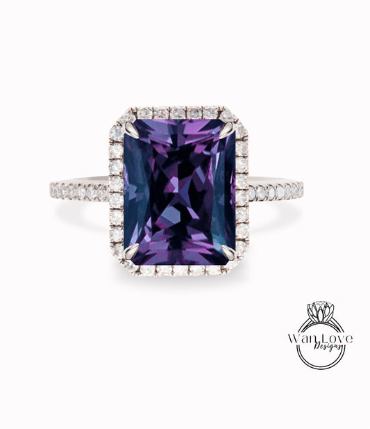 Cambiamento di colore di zaffiro viola alessandrite e anello di fidanzamento con diamante smeraldo Halo Basso 14k 18k bianco giallo oro rosa platino matrimonio personalizzato