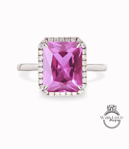 Anello di fidanzamento Halo con zaffiro rosa e diamante smeraldo, gambo liscio, oro rosa giallo bianco 14k, platino, matrimonio, radioso