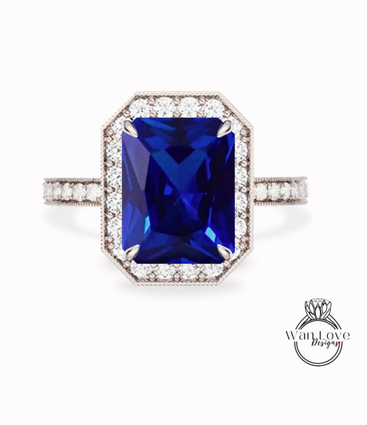 Anello di fidanzamento con zaffiro blu smeraldo Milgrain Halo / Anelli con zaffiro blu Half Eternity / Anelli di nozze Diamond Halo / Anello di dichiarazione