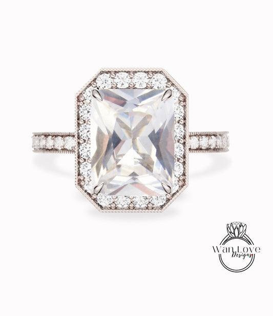 Anello di fidanzamento con zaffiro bianco smeraldo Milgrain Halo / Anelli con zaffiro bianco Half Eternity / Anelli di nozze Diamond Halo / Anello di dichiarazione