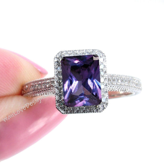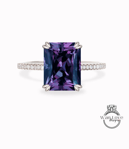 Anello di fidanzamento con zaffiro viola, colore alessandrite e diamante, smeraldo radiante, 14k, 18k, bianco, giallo, oro rosa, platino, matrimonio personalizzato