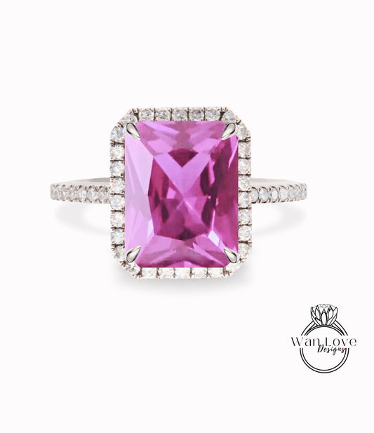 Anello di fidanzamento con zaffiro rosa e diamante smeraldo radiante Halo, oro rosa giallo bianco 14k 18k, anniversario di matrimonio personalizzato in platino