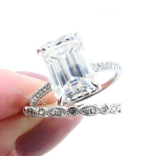 Set di anelli di fidanzamento con taglio smeraldo con moissanite e diamanti, fede nuziale per l'eternità completa, personalizzato-14k 18k bianco giallo oro rosa-platino
