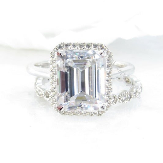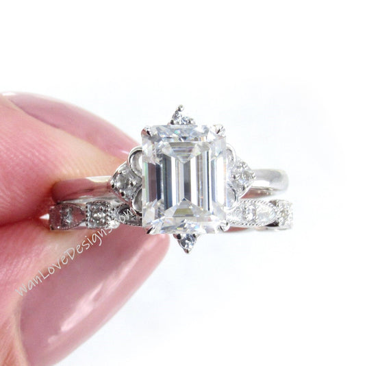 Anello di fidanzamento con smeraldo e diamante Moissanite, set di fedi nuziali smerlate Art Déco Milgrain, personalizzato-14k,18k, bianco, giallo, oro rosa-platino