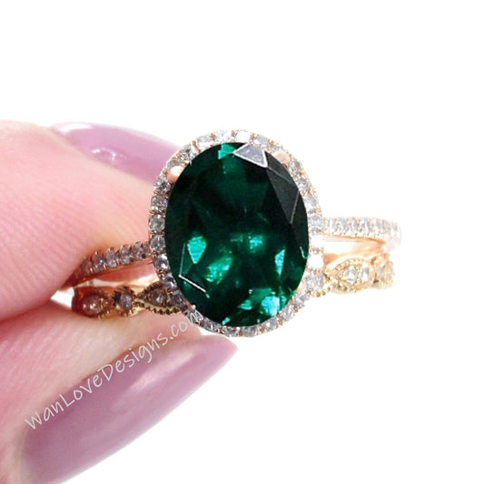 Anello di fidanzamento ovale con smeraldo Set Anello di fidanzamento vintage Halo in oro rosa Pera Mezza eternità Anello con diamante Regalo per l'anniversario della sposa