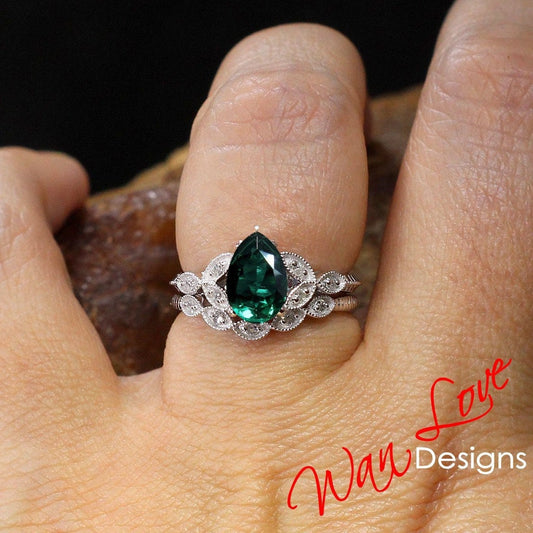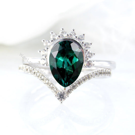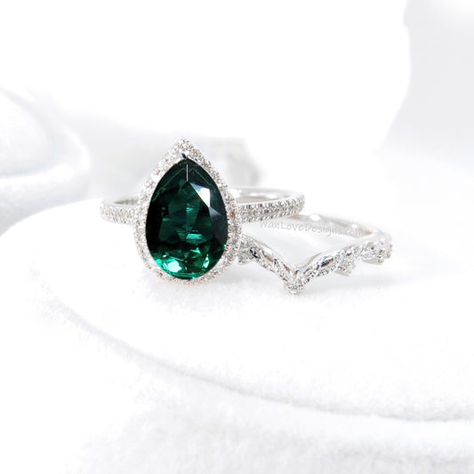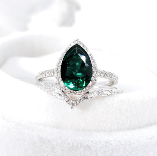 Set di anelli di smeraldi e diamanti con alone di pera, anello di fidanzamento e fede nuziale con 7 gemme, anello monstone, anello di nozze di diamanti, anello di fidanzamento a foglia