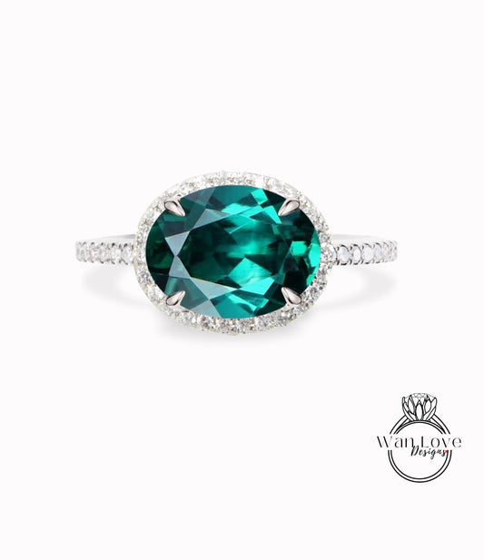 Anello di fidanzamento East West con smeraldi e diamanti Halo Set di fedi nuziali smerlate Personalizzato-Anniversario-14k 18k Bianco Giallo Oro rosa-Platino