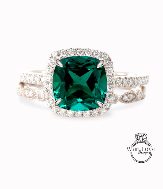 Anello di fidanzamento Halo con cuscino di smeraldi e diamanti, set di fedi nuziali, rotondo, 14k 18k bianco giallo oro rosa, platino, personalizzato