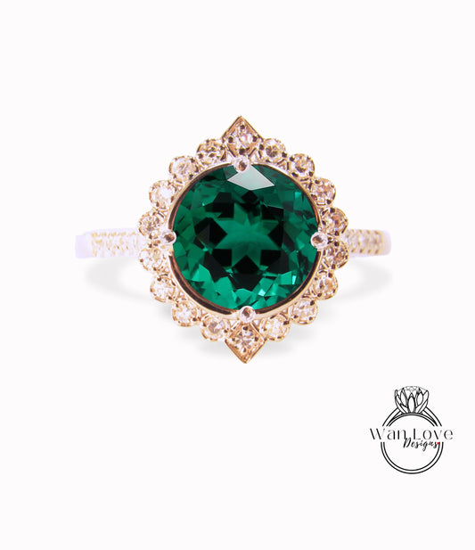 Anello di fidanzamento Halo geometrico con smeraldi e diamanti rotondo, personalizzato, 14k 18k bianco giallo oro rosa-matrimonio in platino, WanLoveDesigns
