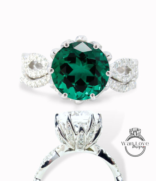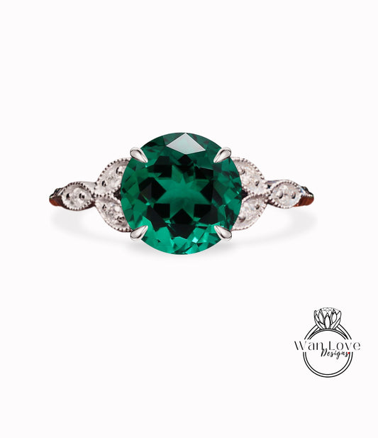 Anello di fidanzamento a grappolo con foglia rotonda con smeraldi e diamanti, con incisione Milgrain, liscio, in oro 14kt, 18kt, platino, matrimonio personalizzato