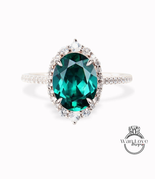 Anello di fidanzamento Halo ovale graduato con smeraldi e diamanti, personalizzato, matrimonio, 14k 18k bianco rosa oro giallo, platino, WanLoveDesigns