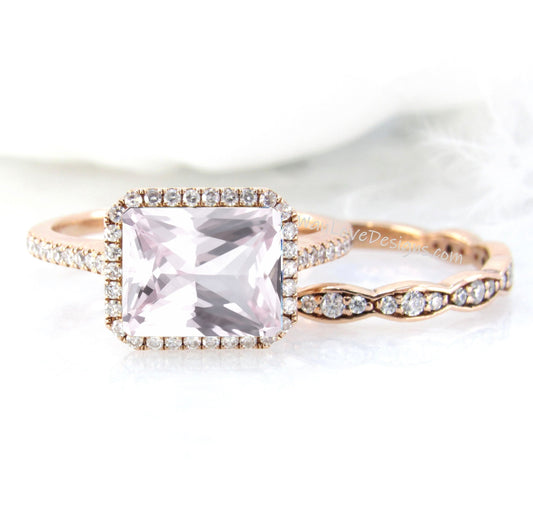 Anello di fidanzamento East West con zaffiro rosa chiaro e diamanti Halo Fede nuziale smerlata con smeraldo Set personalizzato-Anniversario-14kt Oro 18kt-Platino